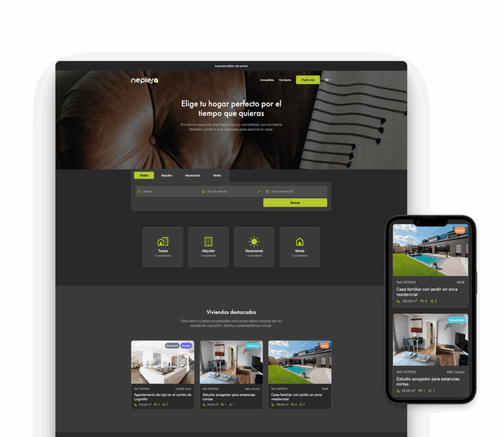Sabemos que el tiempo es valioso. Por eso, Viviq está diseñado para que cualquier inmobiliaria pueda construir su propia web con unos pocos clics. Sube inmuebles, personaliza diseños y empieza a captar clientes de inmediato. Todo en una plataforma intuitiva y eficaz.